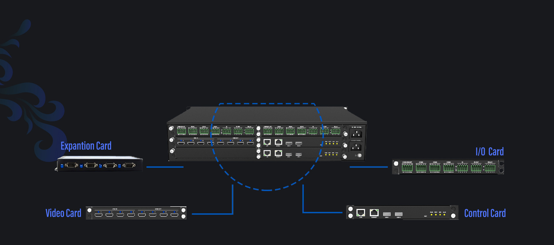 To meet everchanging demand, project may expand its scale by adding additional devices. UniManager offers flexibility to further system expansion thorough its modular designed structure. Versatile cards, such as I/O cards, video cards and serial cards, can be added to chassis.
