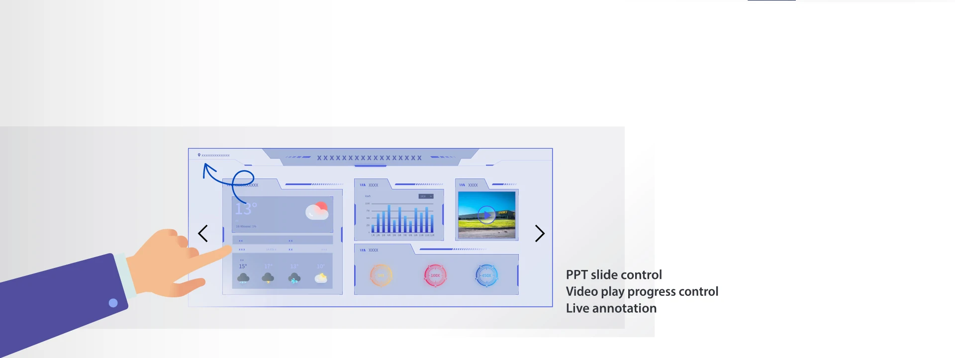 Through a control interface, users can easily move to the next or previous page of selected files. You can do annotations on file and sync to a video wall. Animation is supported as well for PPT files. As for webpages, you can move up/down the page and collaborate with a multiple-level menu through a control interface.