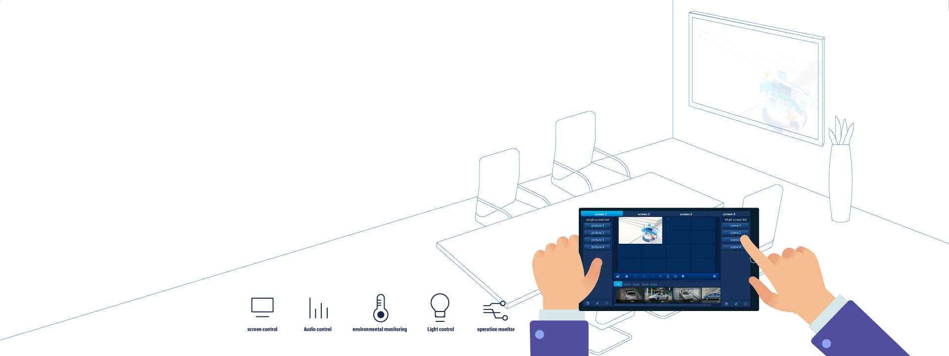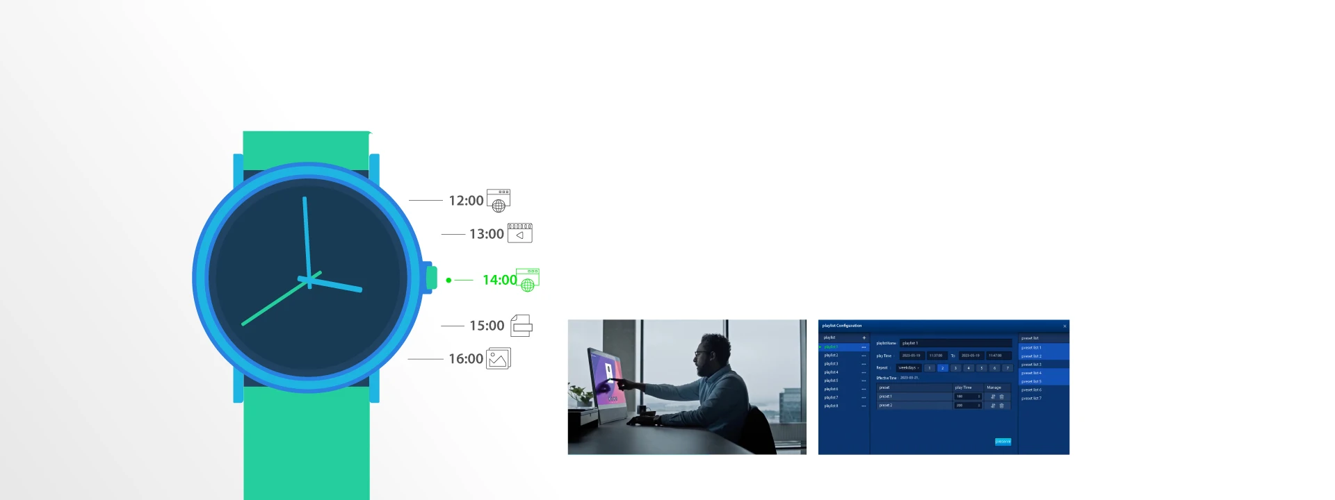 Desired contents will be presented to the audience following a pre-designed schedule. A plan combined with multiple presets, such as video wall display, audio devices, and environmental devices, can be triggered and executed in a collaborative way.