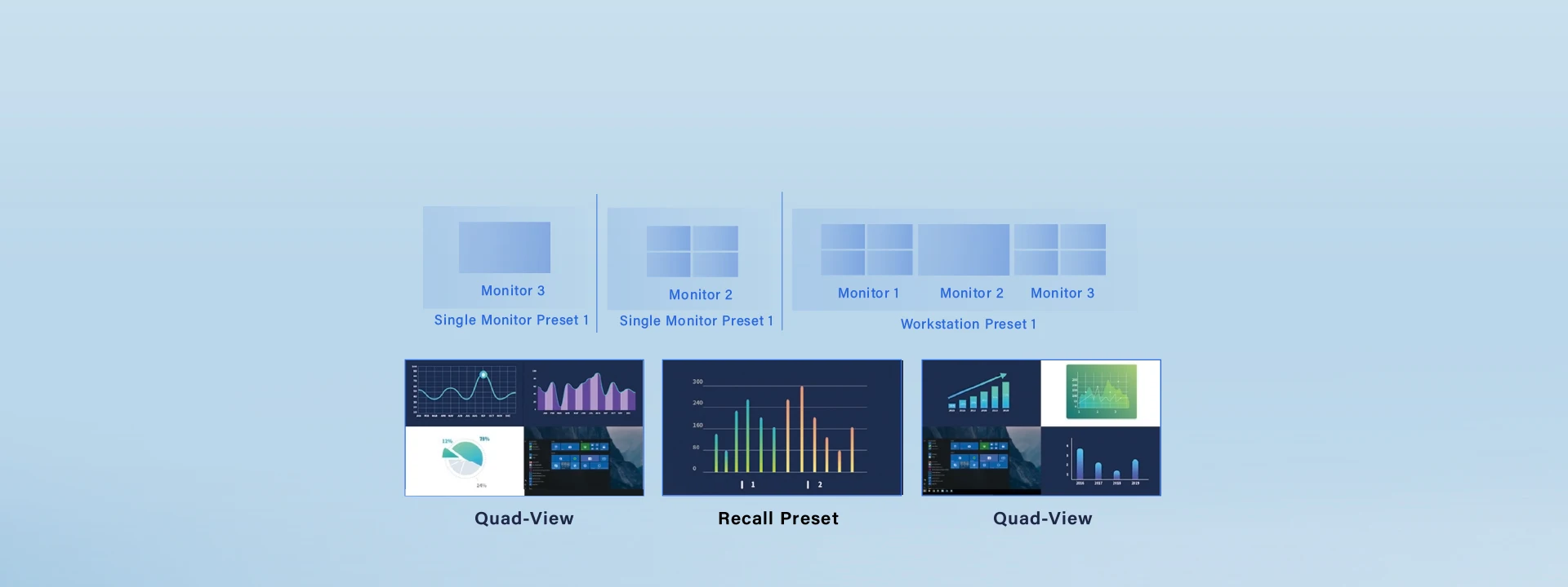 Featured with free slide among monitors, UniStream-H enables operator manager work with multiple monitors through one keyboard and mouse set. For each monitor, operator can either enable single-view to work on details or quad-view to watch more computers.