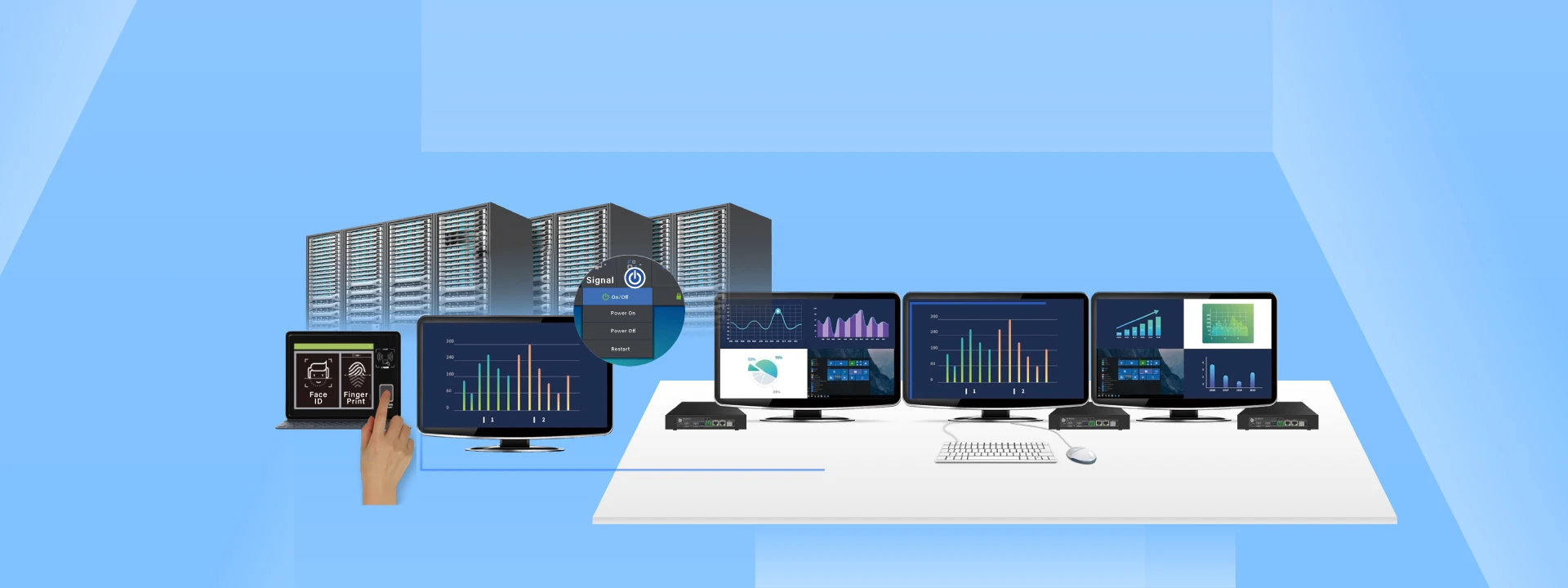 UniStream-H offers a smart method to manage user account. Log in over Face ID and Finger print is supported. Operator is able to power on or power off remote computers via OSD menu at workstation.