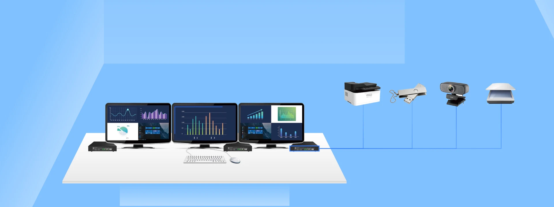 The system complies with USB 2.0 protocol, allowing operators to access USB devices, such as portable storage devices, printers, and cameras from workstation side even when the computer is physically located in server room.
